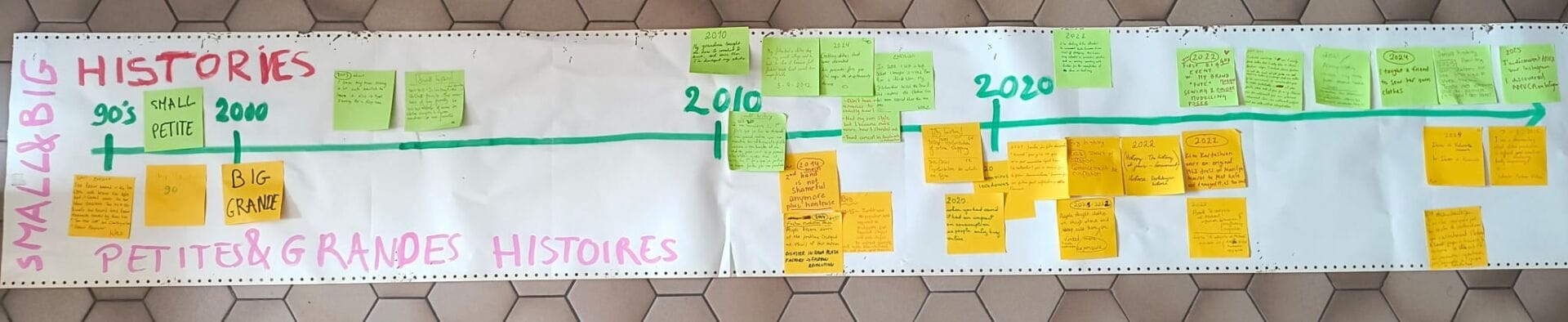 - Seinälle tai pöydälle tehdään aikajana. Jokainen saa vuorotellen esitellä omat ison ja pienen historian nostonsa, ja asettaa ne post-it lapuissa aikajanalle oikeaan ajankohtaan. Isot historiat voi koota esimerkiksi aikajanan yläpuolelle ja pienet historiat alapuolelle tai käyttää eri värisiä post-it lappuja.