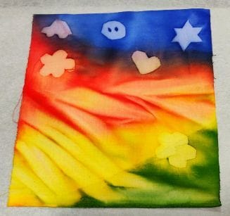 Kuviot voi leikata esimerkiksi muovitaskun muovista. Huomioi kuitenkin, että kuvion ääriviivoja piirtäessäsi käytät kynää, joka ei liukene märkään kankaaseen. Aurinkovärjäyksestä löydät tarkempia ohjeita Punomon sivuilta.
