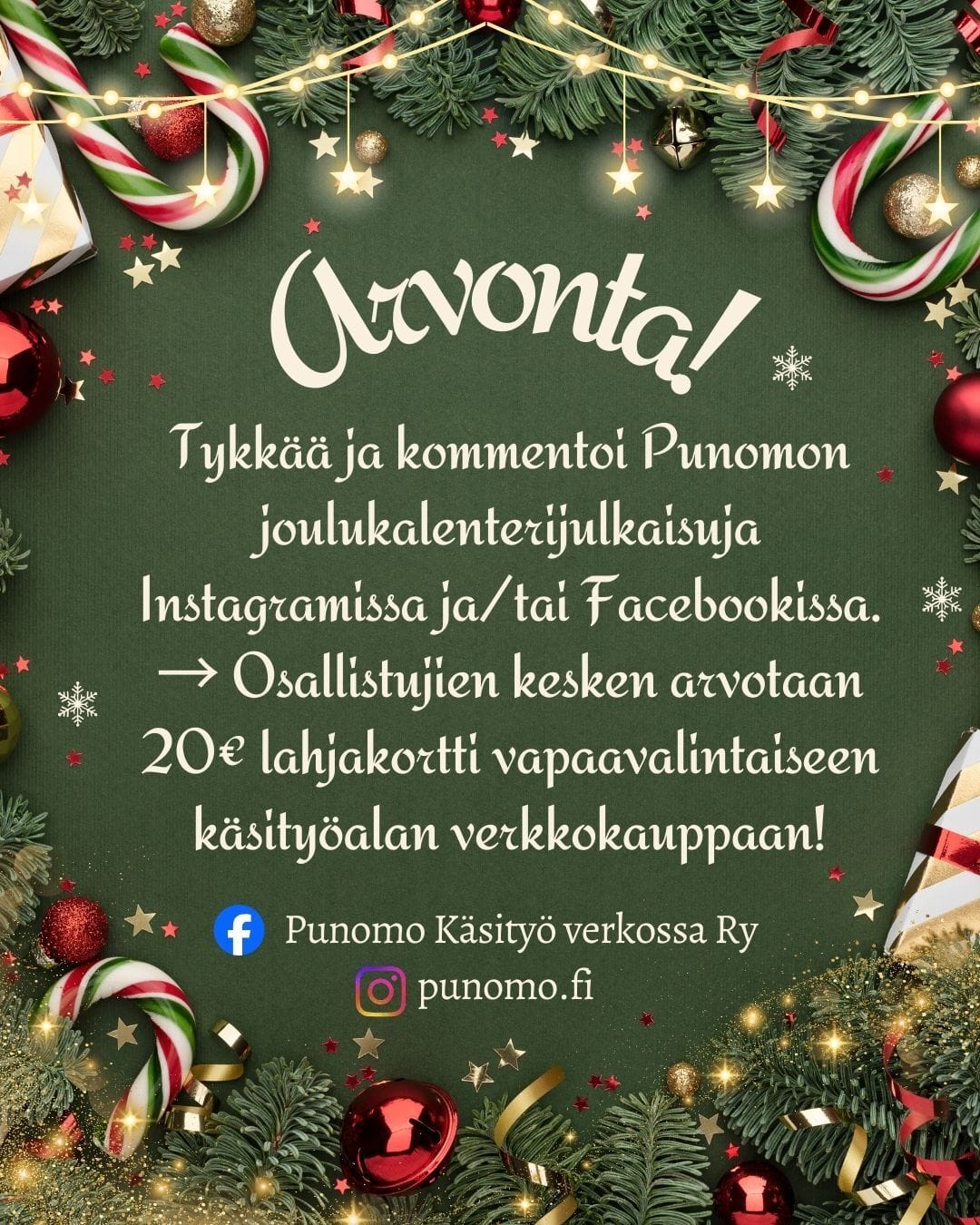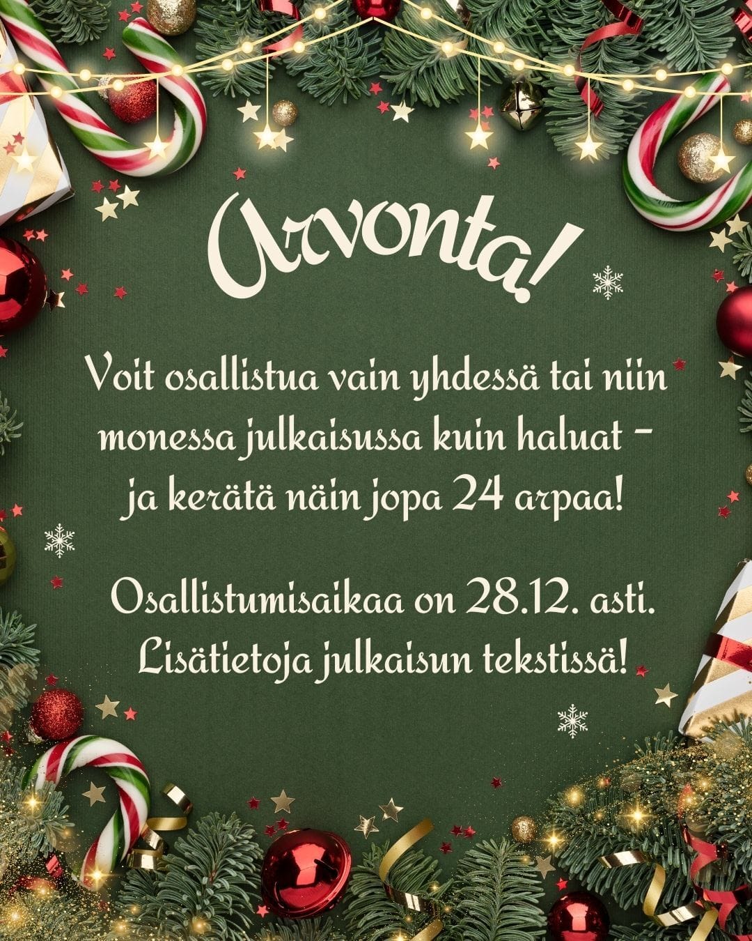 Osallistumisaikaa on 28.12.2025 asti, jonka jälkeen suoritetaan arvonta. Voittajalle ilmoitetaan yksityisviestillä. Huom! Voiton lunastus ei vaadi minkään linkkien klikkaamista ja Meta, Facebook tai Instagram eivät ole mitenkään mukana arvonnassa.