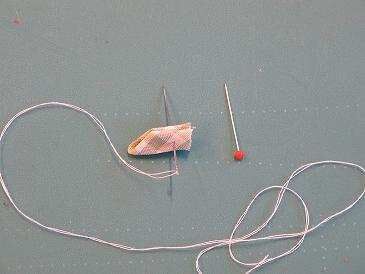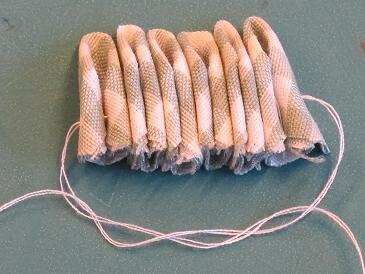 10. Kiinnitä kaikki palat keskeltä langalla ja neulalla rivistöksi, sulje rivi kankurinsolmulla ympyräksi