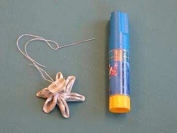 12 Leikkaa kankaasta ympyrä ja liimaa se kangasliimalla kukan taakse, tuo ompelulanka kankaan keskeltä ja ompele kukka pinniin kiinni