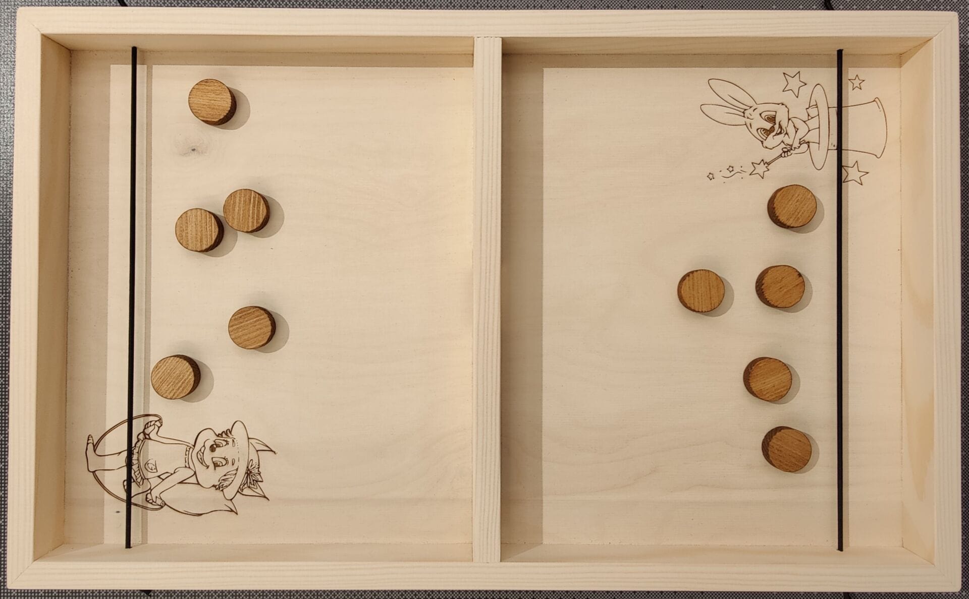 Leikkaa kuminauha kahteen yhtä pitkään osaan. Pujota kuminauhan pää sille poratusta reiästä. Tee päähän tiukka solmu. Pujota kuminauhan toinen pää vastakkaisesta reiästä. Kiristä kuminauha tiukalle ja tee päähän solmu. Leikkaa ylimääräinen pätkä kuminauhasta pois. Kiinnitä toinen kuminauha pelilaudan toiseen päähän.