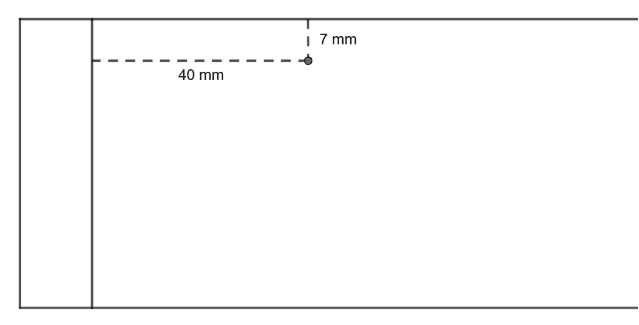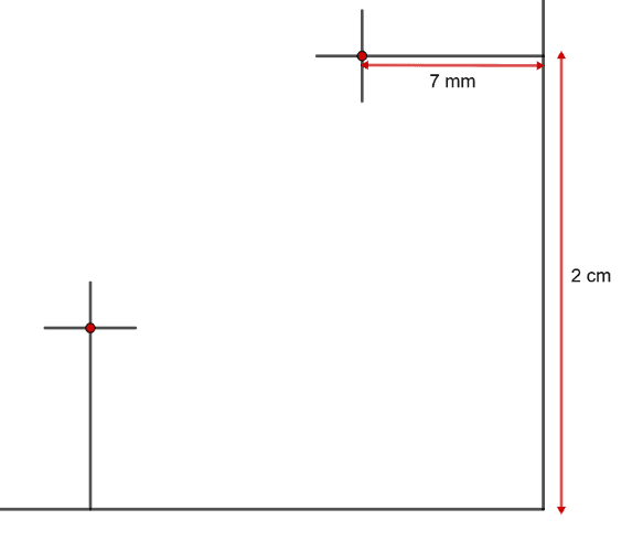 Mittaa nurkasta 2 cm ja piirrä merkki. Mittaa merkin kohdalta reunasta 7 mm. Merkkaa kohta purasimella.