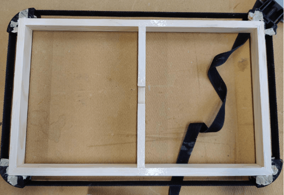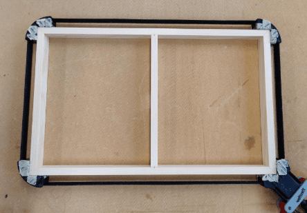 Kiinnitä jokaiseen kulmaan puristin. Kiinnitä puristimet lisäksi keskelle pitkiä sivuja kuvan mukaisesti. Käytä puristimien ja työn välissä hukkapaloja.