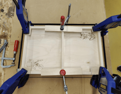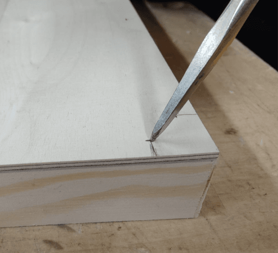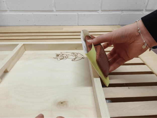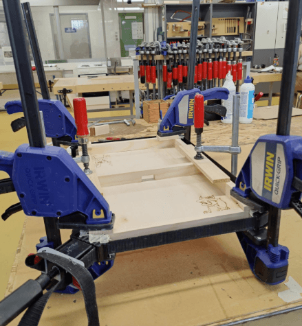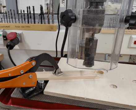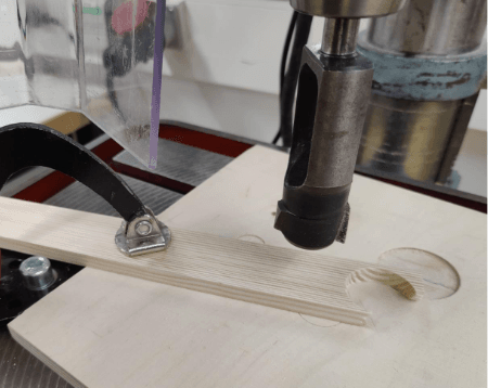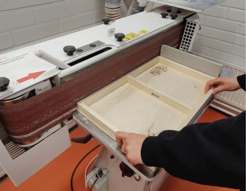 Kun liima on täysin kuivunut, voit hioa nauhahiomakoneella ylimääräisen vanerin pois. (Muista suojalasit ja kuulosuojaimet)