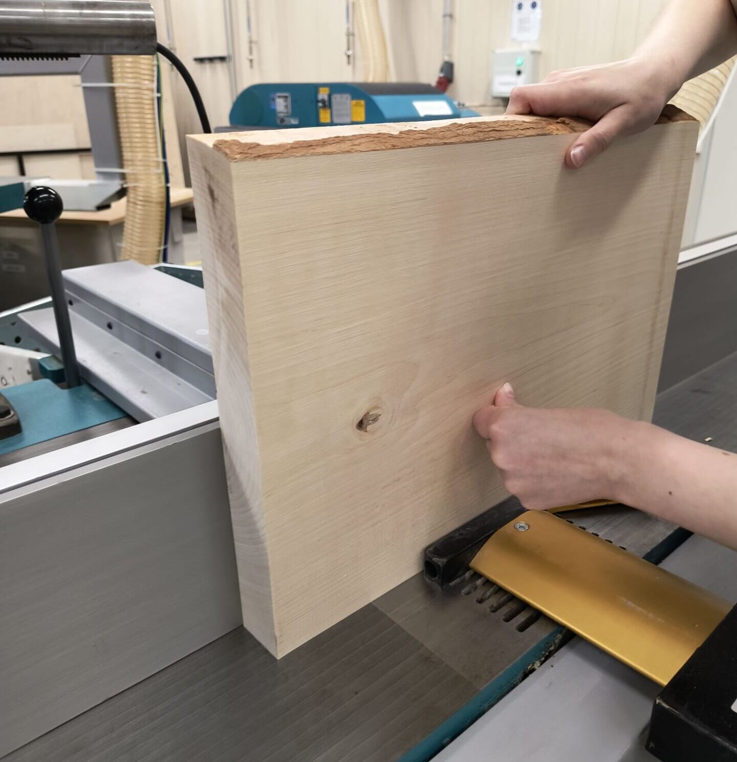 Seuraavaksi suoristetaan lankun syrjät. Jos ne ovat kovin vinot, voit ennen höyläämistä myös sahata ne ensin suoremmaksi.
