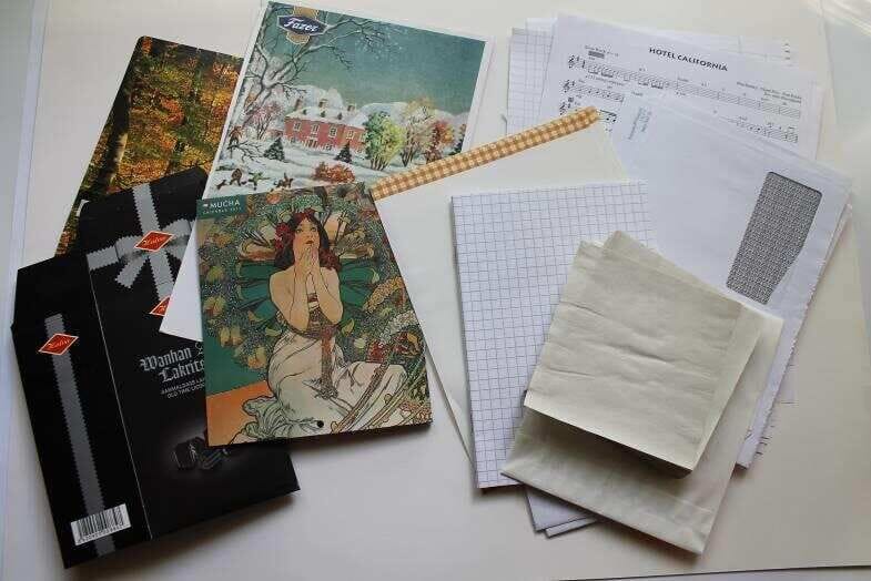 vihkon sivuiksi (hukkatulosteita, kirjekuoria, vihkojen ylimääräisiä sivuja…) - kierrätyskartonkia vihkon kansiksi (esim. pakkauksista)
