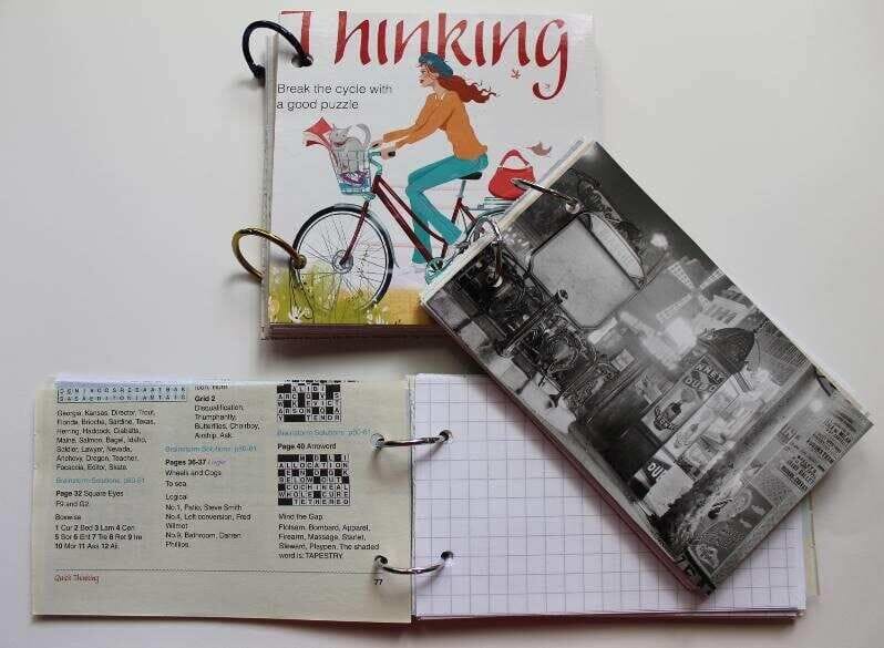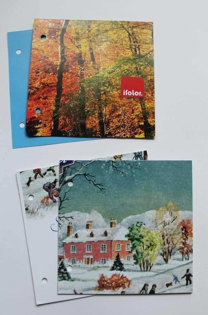 - Pujota sitten takakannen päälle valmiiksi leikattuja sivuja. Sekoittele erilaisia papereita keskenään, niin vihkoa on hauskempi selata. Älä täytä rengasta liian täyteen, vaan kokeile välillä saatko renkaan vielä kiinni ja pystyykö sivuja selaamaan.