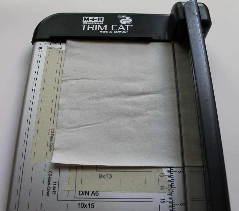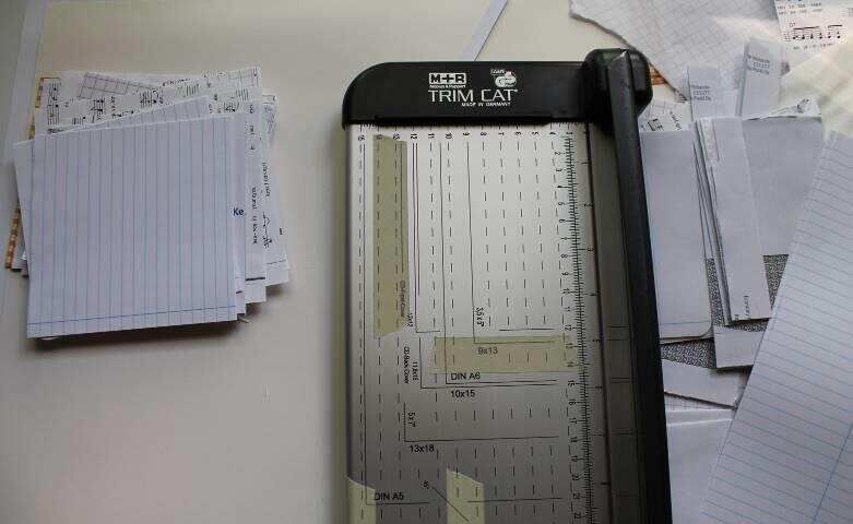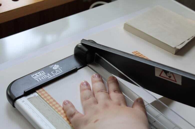 - Leikkurin vasemmalla puolella valmiita leikattuja sivuja, oikealla leikkausjätettä. Älä heitä leikkausjätettä suoraan pois, vaan tee siitä esim. pienempi vihko.
