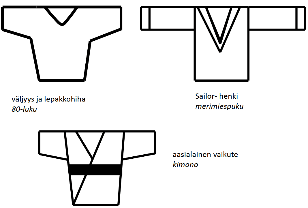- tutkitaan muotoa, värien yhteensopivuutta ja yksityiskohtia (leikkaukset, muotolaskokset, kaulukset, taskut ym.) ja materiaalia suhteessa malliin