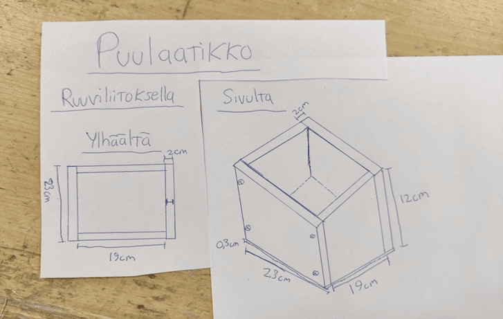 Tässä työohjeessa tehdään ruuviliitos ja valmistetaan puulaatikko. Jos haluat nähdä vain ruuviliitoksen, löytyy se kohdasta 10-12.