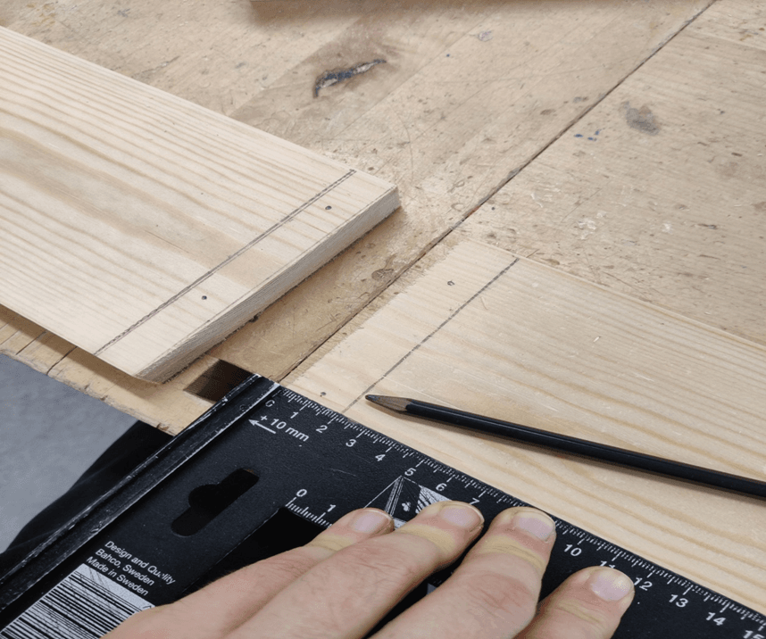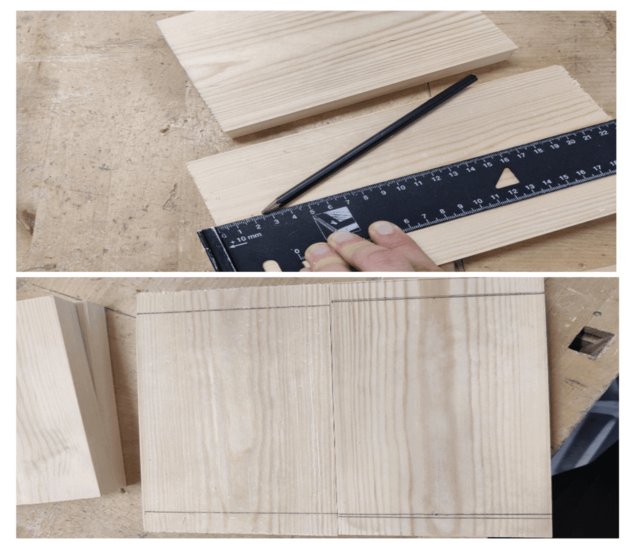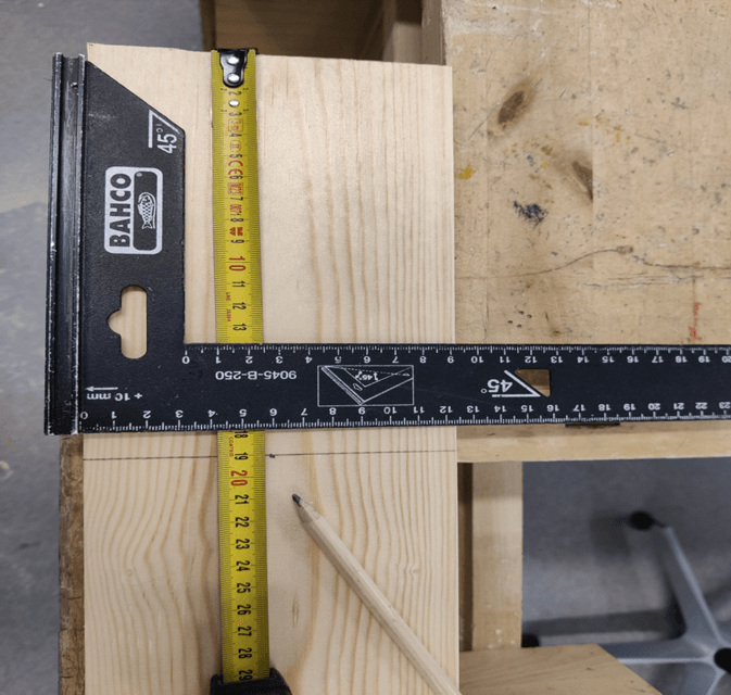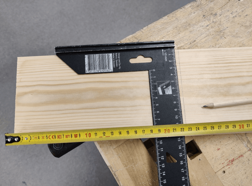 Mittaa laudasta 2kpl 19cm pituista palaa. Käytä suorakulmaa.
