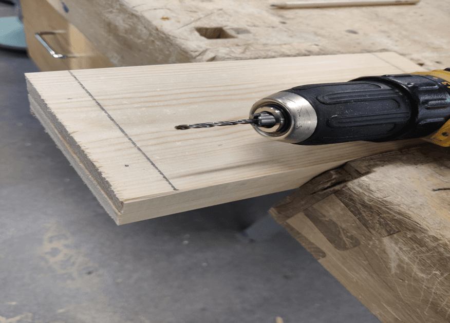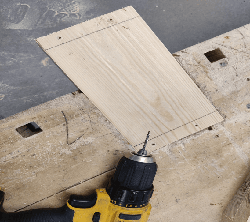 Poraa merkittyihin kohtiin reikä. (Huom. sivulaudat päällekkäin!)