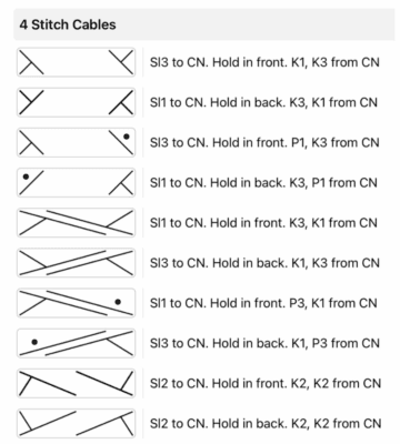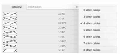 Ohjelmissa on valmiit palmikkosymbolit ja on makuasia, mikä niistä miellyttää eniten. Symboleihin liittyy merkkien selitys englanniksi. DesignaKnitissa saa palmikot näytölle ruudukon lisäksi myös silmukkamuodossa.
