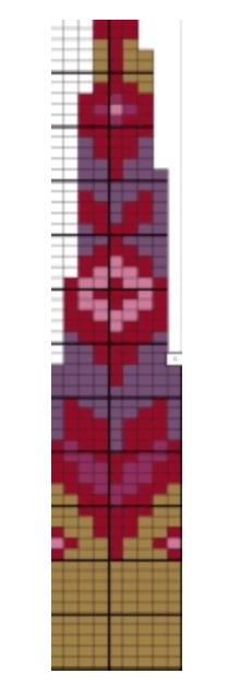Tee tarvittavat laskelmat kavennuksista/lisäyksistä. Sen jälkeen pääset piirtämään kaarrokeosan kuvioinnin. Alla on Stitch Fiddlellä tehty esimerkki, jossa kavennuksia on viidellä kerroksella.
