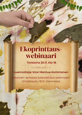 Tule oppimaan uutta ekoprinttauksesta! Punomo järjestää torstaina 20.11. klo 18 webinaarin ekoprinttauksesta. Luennoitsijana toimii Kirsi Mantua-Kommonen, joka on parhaillaan kirjoittamassa aiheesta kirjaa, mutta tulee jakamaan meille tietojaan jo etukäteen ennen kirjan julkaisua! Webinaari toteutetaan verkossa, joten voit osallistua mistä päin tahansa.