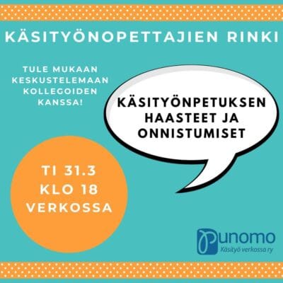 Ringin seuraava tapaaminen on tiistaina 31.3. klo 18. Aiheena on käsityönopetuksen haasteet ja onnistumiset. Onko haasteena esimerkiksi eriyttäminen, kielitietoinen opetus tai monimateriaalisuus? Entä missä koet onnistuneesi opetuksessa? Oletko kenties keksinyt jonkin toimivan ratkaisun, jonka voisit jakaa muille käsityönopettajille? Tule mukaan keskustelemaan muiden kollegoiden kanssa ja jakamaan niin vertaistukea kuin ideoita ja vinkkejäkin!
