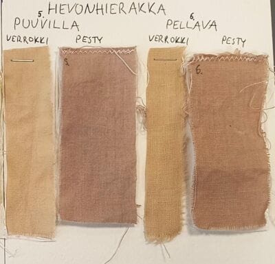 Vaikka hevonhierakka on muille rikkaruoho eikä ulkonäöltään erityisen kaunis, värjäreille se on arvokas kasvi! Hevonhierakasta saa hyvin kestäviä ruskeita ja punaruskeita sävyjä. Toisessa kuvassa on vierekkäin puuvillalle ja pellavalle värjätyt näytteet heti värjäyksen jälkeen sekä konepesun jälkeen, joka muutti väriä punertavammaksi. Hevonhierakka on tanniinipitoinen, joten värjätessä ei tarvitse käyttää erikseen muuta tanniinia, tosin alunapuretus on silti suositeltavaa.